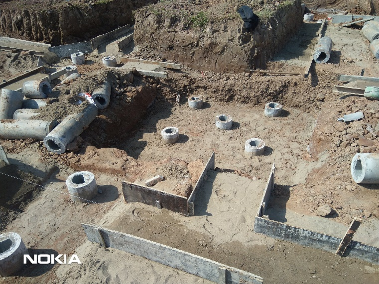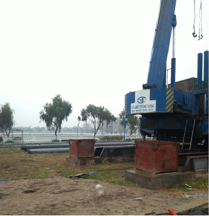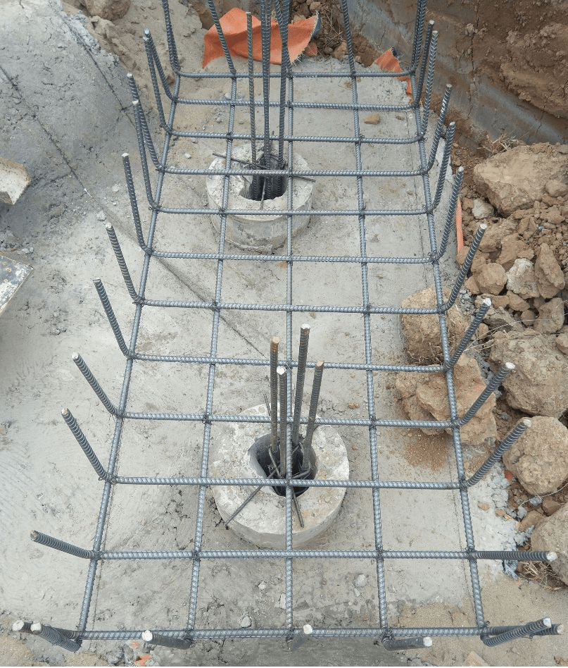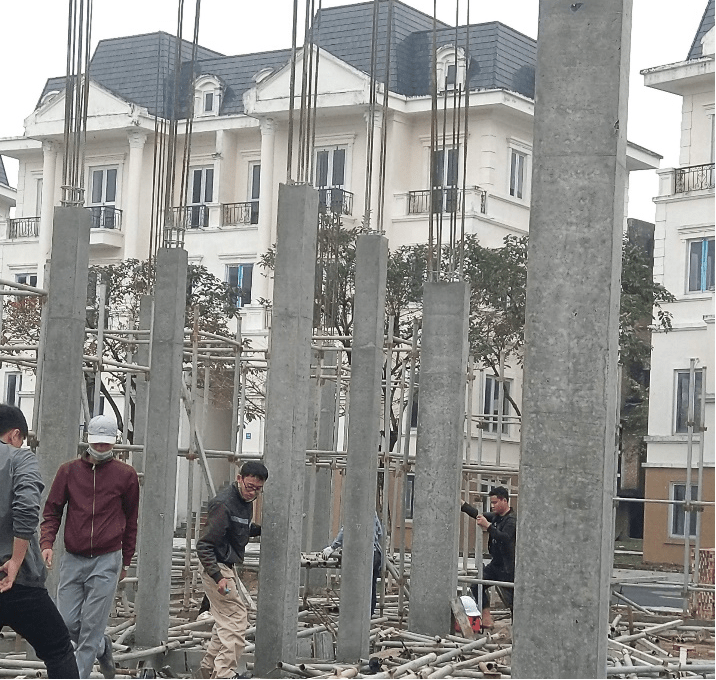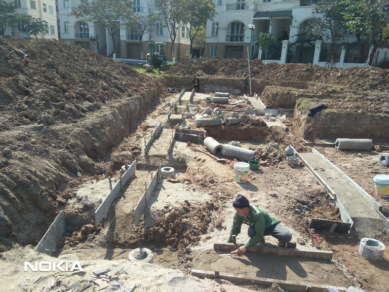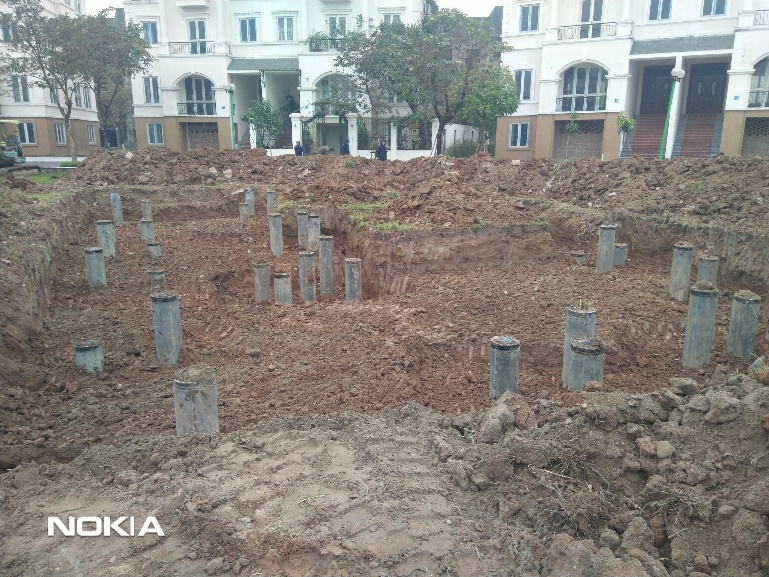 - Đào móng, cắt đầu cọc, giác móng (định vị tim trục, khung móng)